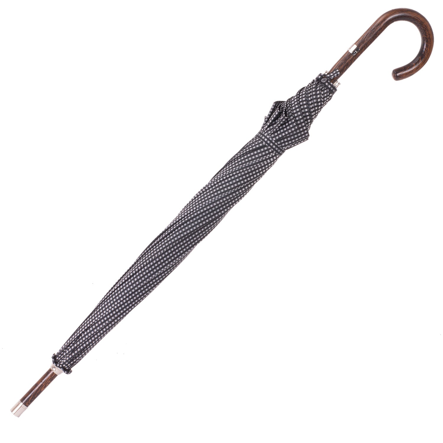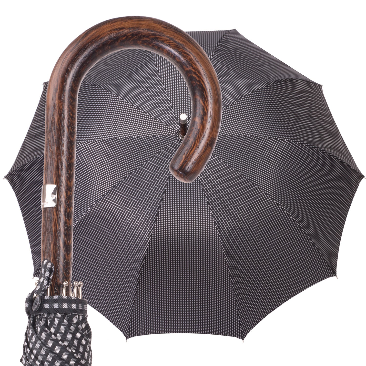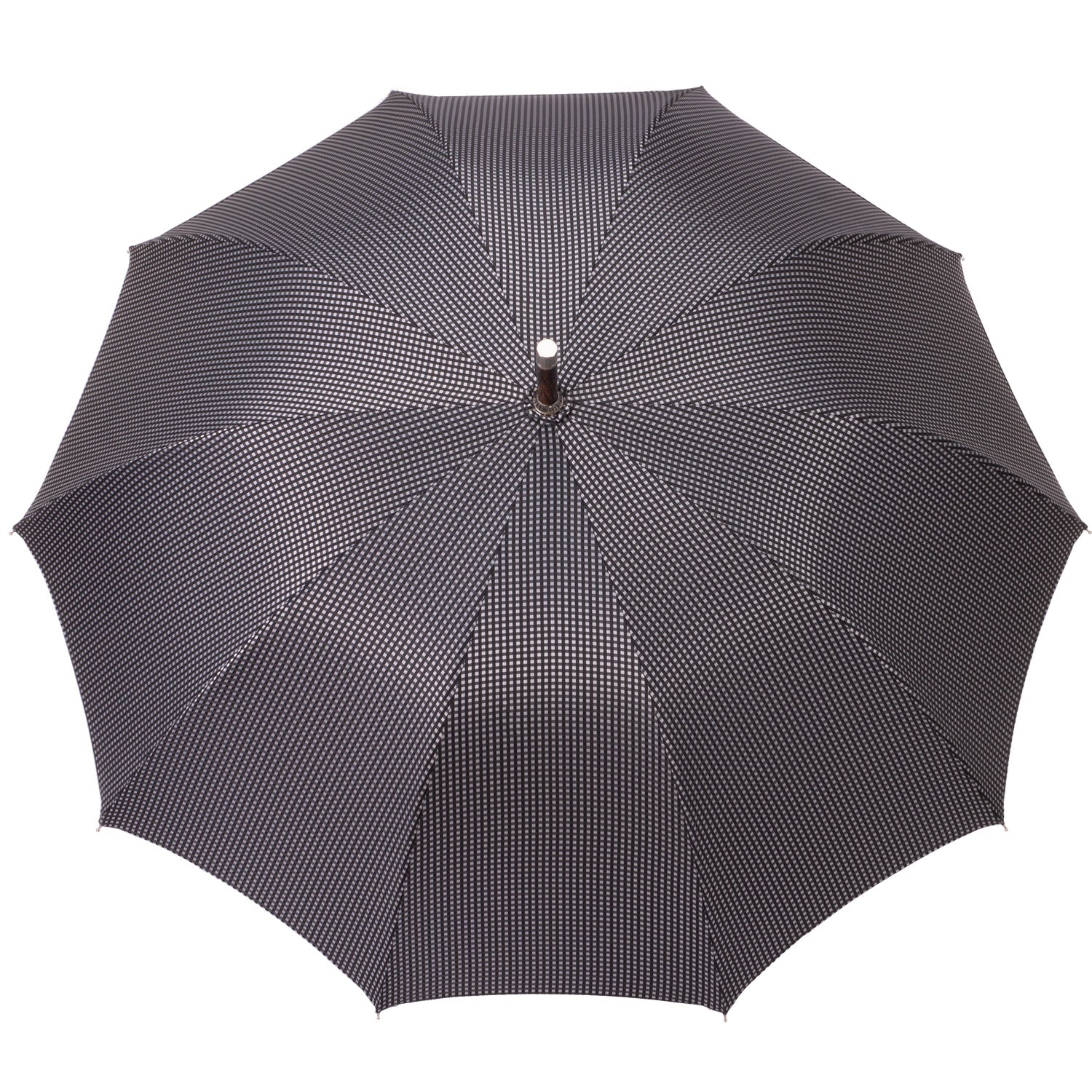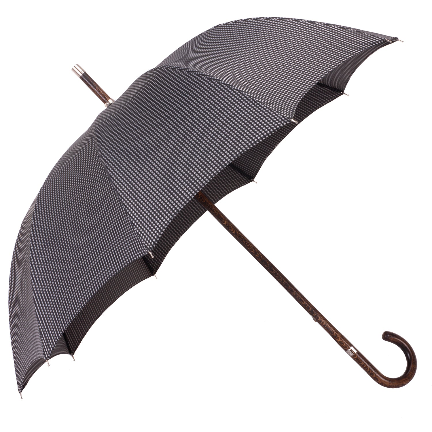 Dieser Herrenschirm wird aus einem Stück naturgewachsenem hochwertigem Eichenholz in Handarbeit angefertigt. Das Gestell hat 10 Stangen, um mehr Größe und Stabilität in das Schirmdach zu bringen, das den traditionellen, leicht glockenförmigen Zuschnitt hat. Für das Schirmdach haben klassische und zeitlose kleine Karos in en Farben Schwarz und Grau ausgewählt. Zwei Schließbänder vereinfachen die Handhabung bei dem Zusammenrollen und beide besitzen Perlmutt-Knöpfe (Mother of Pearl) Ein Futteral aus dem Material des Schirmdaches, schützt vor Verschmutzung. Selbstverständlich wird dieser besondere Herrenschirm komplett ohne Plastikteile angefertigt. So vereint unser Produkt Luxus und Qualität. Die sorgfältige Verarbeitung dieses edlen und robusten Materials garantiert nicht nur zeitlose Schönheit, sondern auch eine Beständigkeit, die Generationen überdauert. Das macht den Herrenschirm aus Eichenholz zu ein Spiegelbild von Charakter, Tradition und wahrer Eleganz und Bodenständigkeit.