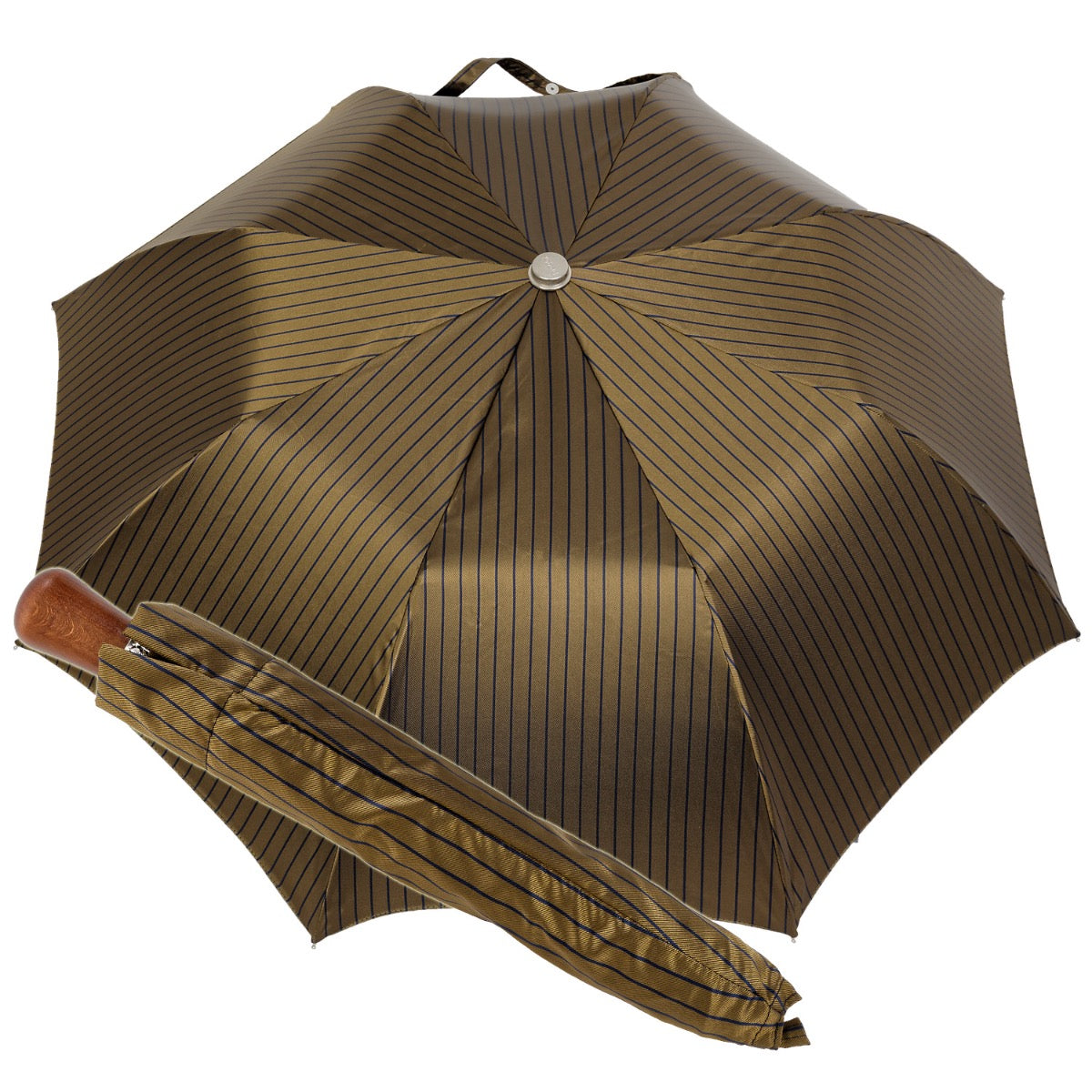 Ein Taschenschirm der Extraklasse. Das hochwertige Schirmdach aus schwerem Satin wird in Italien gewebt. Die kontrastreichen Nadelstreifen überraschen mit neuen modernen Farben und der leichte Glanz des Satins ergeben ein Schirmdach, dass sowohl einfach schön und zeitlos ist, sowie modisch und attraktiv ist. Die Innenseite des Schirmdachs ist einfarbig. Sie müssen lange suchen, um etwas Gleichwertiges auf einem Taschenschirm zu finden. Das Gestell aus gehärtetem Stahl ist Hochglanz vernickelt. Die einzelnen Stangen werden teilweise zweifach übereinander geführt und bieten extreme Stabilität bei allen Wetterlagen. Teile der Stangen weisen besondere Konstruktionsmerkmale auf: Kastenprofile und verwindungsfreie Formteile. Ein hochwertiger Mechanismus sorgt für eine kinderleichte Handhabung und garantiert eine lange Lebensdauer. Durch simples Hochschieben öffnet sich der Schirm schnell und zuverlässig und lässt sich durch Abspannen und Herunterziehen ebenso unkompliziert wieder schließen. Alle Nieten sind massiv Messing. Ein exklusives Highlight dieses Taschenschirms ist der polierte handgearbeitete Holzgriff aus kanadischem Ahorn. Der Taschenschirm wird mit einem Stofffutteral geliefert.feinen kontrastreichen Nadelstreifen